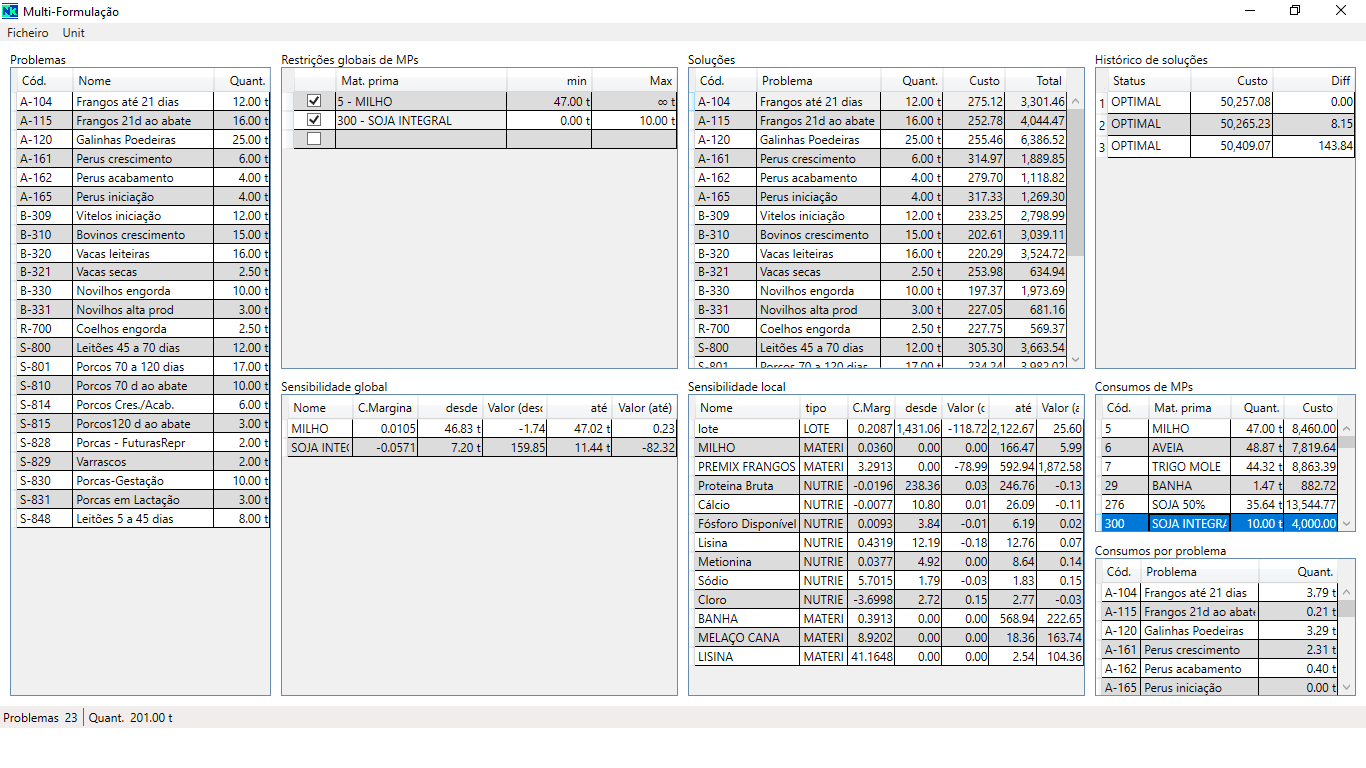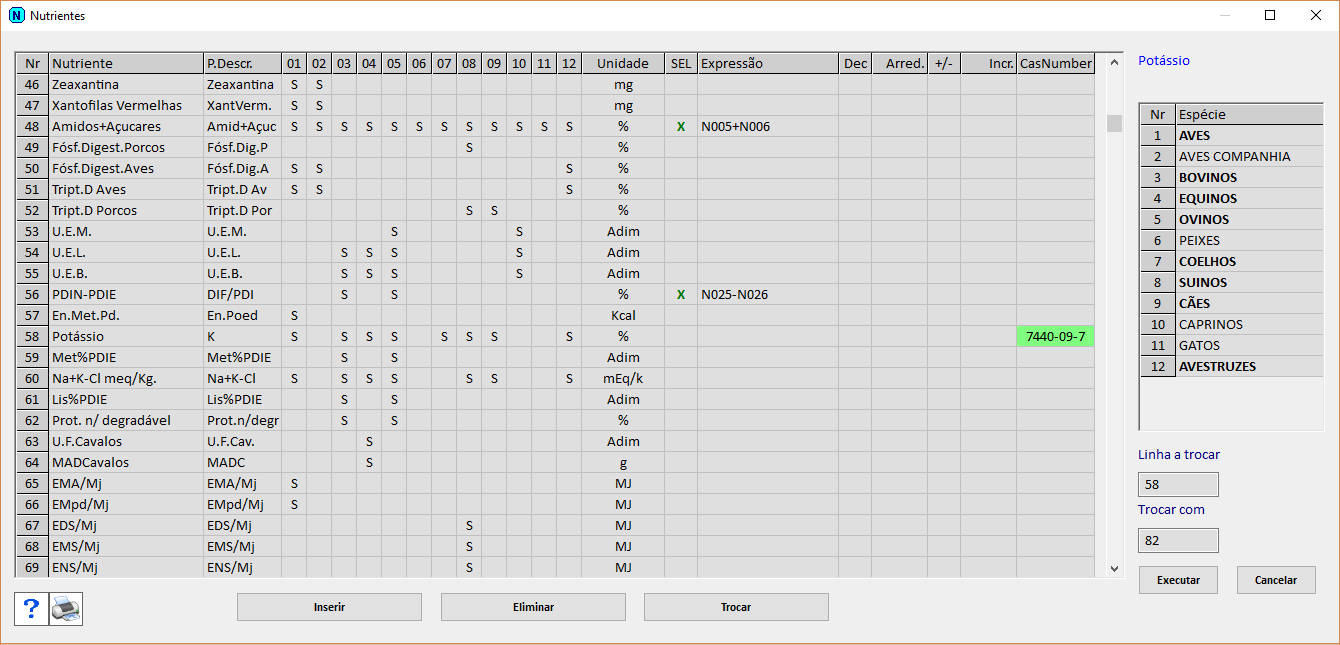 • Revisão das operações "Inserir", "Eliminar" e "Trocar" As operações passam a atuar em todas as unidades de produção abertas na localização, transformando todos os problemas, arraçoamentos, fórmulas, expressões de cálculo e tabelas de conversão A operação "Trocar" executa a troca simples de duas linhas de nutrientes, substituindo a anterior "Transferir", que deslocava todas as linhas posteriores ao transferido, o que nem sempre era simples de interpretar pelo utilizador