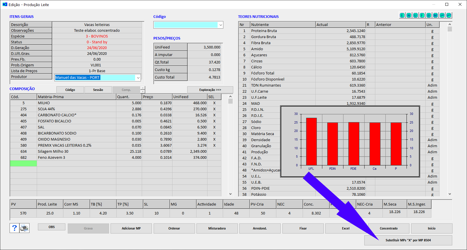- No quadro da fórmula de fabrico, ao regressar ao arraçoamento depois de ter sido gerada MP composta com as MPs do concentrado, passa a estar disponível a possibilidade de substituição automática de todas as MP do concentrado pela MP composta acabada de gerar