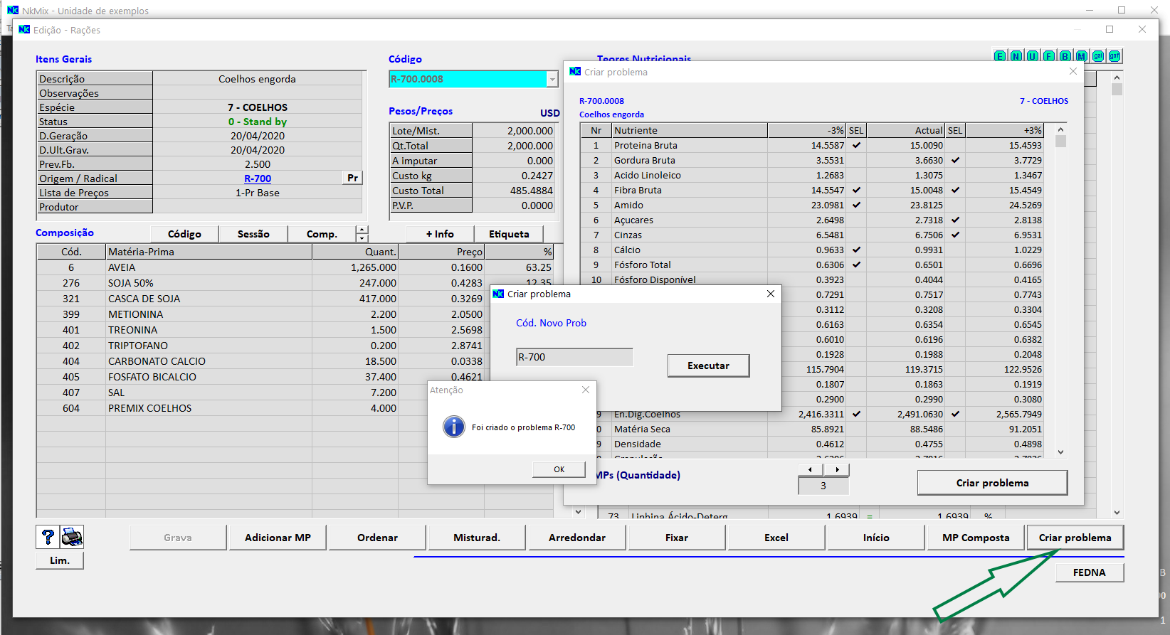 - Geração de um problema a partir de uma fórmula de fabrico - na edição da fórmula, no comando "Gerar problema", acede-se a um quadro onde são exibidos os valores nutricionais da fórmula, uma coluna de valores inferiores ( - x% ) e outra de superiores ( + x% ), permitindo definir para o problema a gerar os valores mínimos e máximos que sejam validados nas respetivas células. Essa validação, bem como a percentagem para definição do intervalo e a opção de transportar para o problema as MPs da fórmula, são guardados para a utilização seguinte por Un.Produção e por espécie. (Esta nova capacidade está integrada no grânulo "Auditoria de fórmulas", pelo que a partir de Março só estará acessível para os utilizadores com o grânulo licenciado)