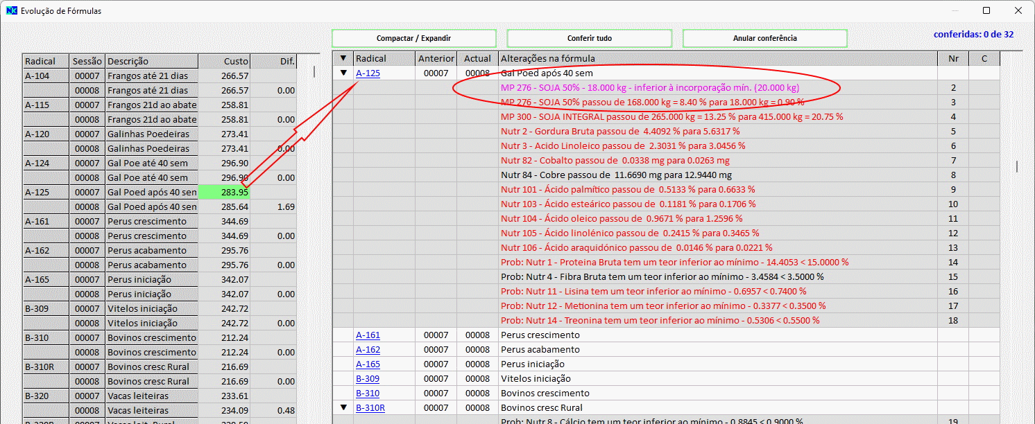 • No quadro de Atualização-Manutenção de Fórmulas, a seleção de Fórmulas que contêm uma determinada MP passa a ser sensível à presença dessa MP nos compostos contidos nas fórmulas a selecionar